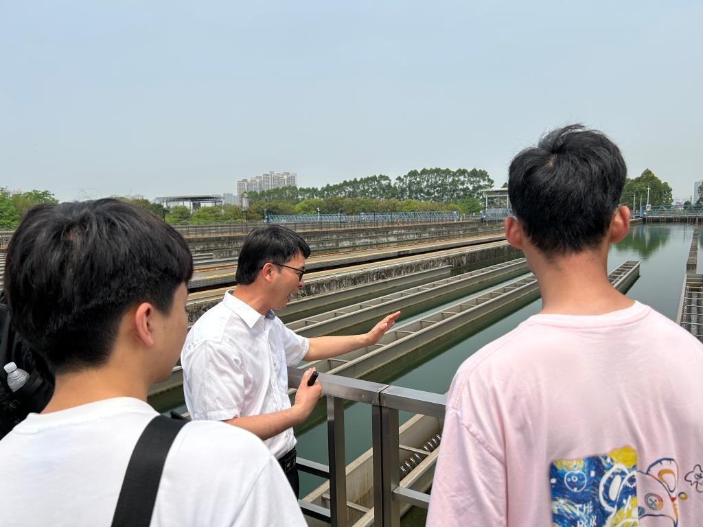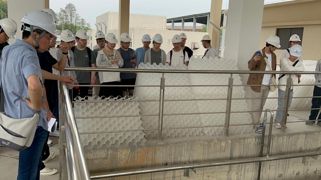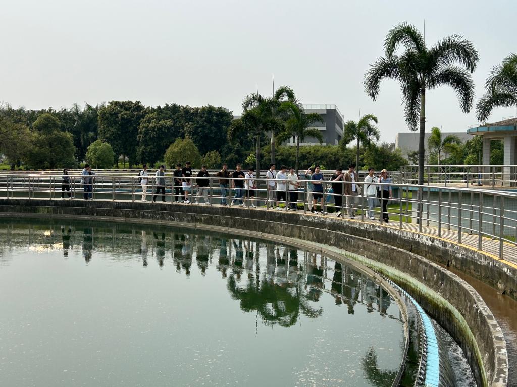 第六水厂厂长余世银带领同学们参观了水厂的全套工艺流程构筑物,主要参观了平流沉淀池、V型砂滤池、臭氧制备车间、生物活性炭滤池等。通过余世银厂长的生动讲解,解答了老师和同学们的疑惑。通过此次前往东莞市水务集团参观交流,学生们将课堂上学到的理论知识与实际工程案例相结合,更深入地理解给水和污水处理的工艺流程、构筑物构造和运行管理难点。此外通过了解水务集团的运营管理模式和水厂工作环境,学生们对自己的职业规划有更清晰的认识。