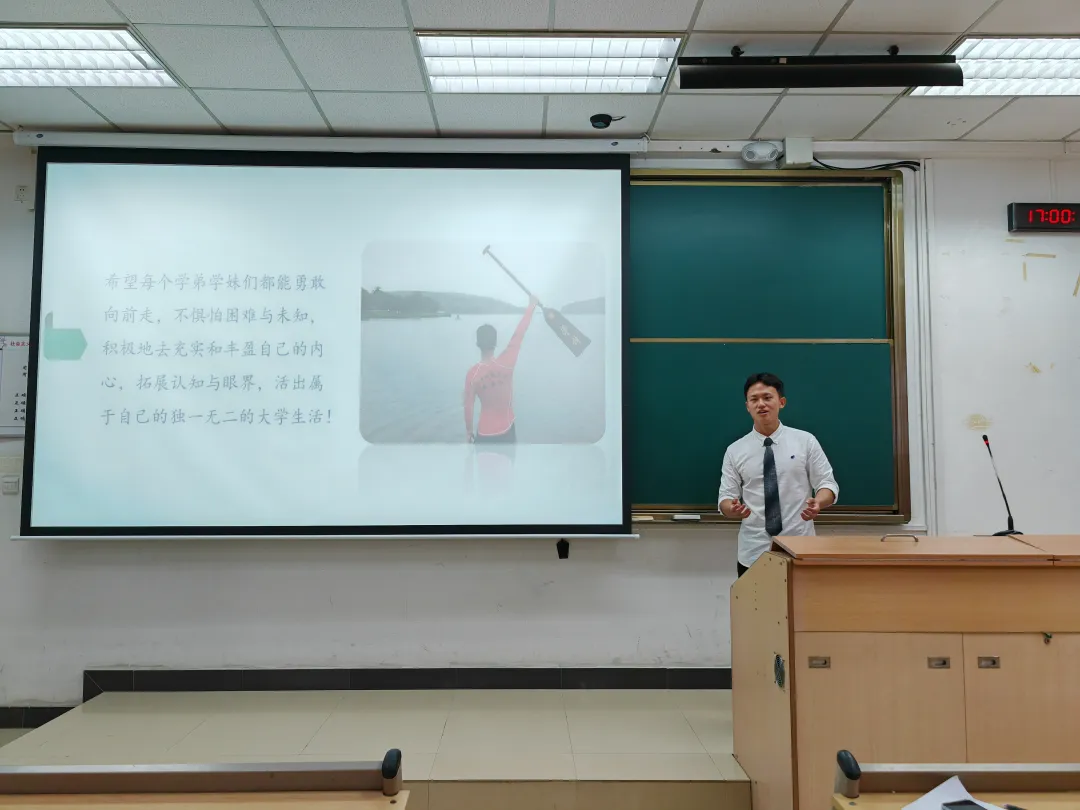 常涵舟同学结合自身参加校龙舟队的经历,分享了自己的四年大学生活,给同学们留下了深刻的启发,以此鼓励同学们培养“龙舟精神”,在生活中有足够的勇气去面对遇到的困难。同时,他还是一位音乐爱好者,讲述了音乐创作的经历,并希望同学们在大学生活中奏响人生最华美的乐章。