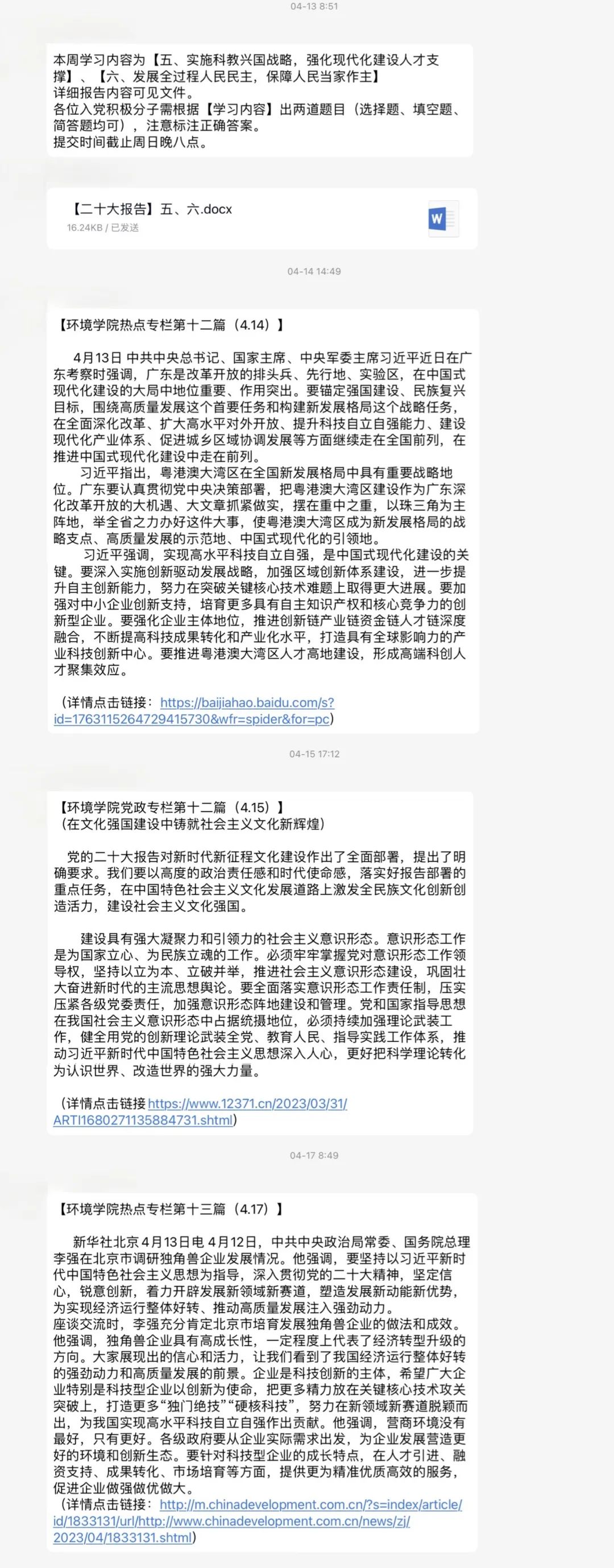 为贯彻落实党的二十大精神,响应华中大“党旗领航工程”的号召,进一步加强环境学院2021级同学们的政治素养,做好入党积极分子的培养教育工作,鼓励大家进一步学习党的基础理论知识,环境学院组织21级入党积极分子围绕党的二十大报告进行学习,并以班级为单位建设学习专栏,每周定期发布推送,聚焦时政热点,以便于同学们日常学习积累。