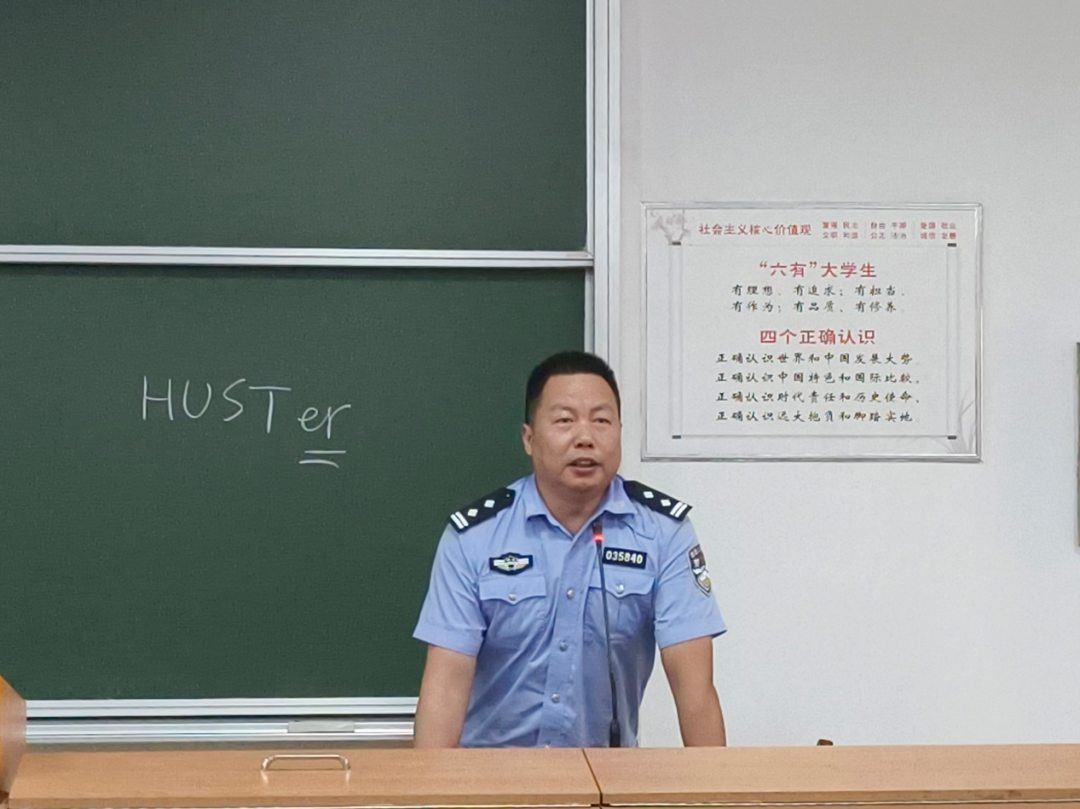 熊警官为全体新生作安全教育报告。他强调,校园生活并不总如同学们所想的祥和安全,平静的湖面也暗藏波涛汹涌。互联网上诈骗案频发,层出不穷的骗术令人防不胜防;教室里、食堂内、篮球场上——那些看似安全的地方危险却出其不意;甚至是车水马龙的马路上,财物盗窃往往只发生在一瞬间。他提醒在场的新生们,切勿以大学生自居而放松警惕,而是居安思危,常怀安全责任的意识,有力的话语无疑为全体新生敲响一记警钟。