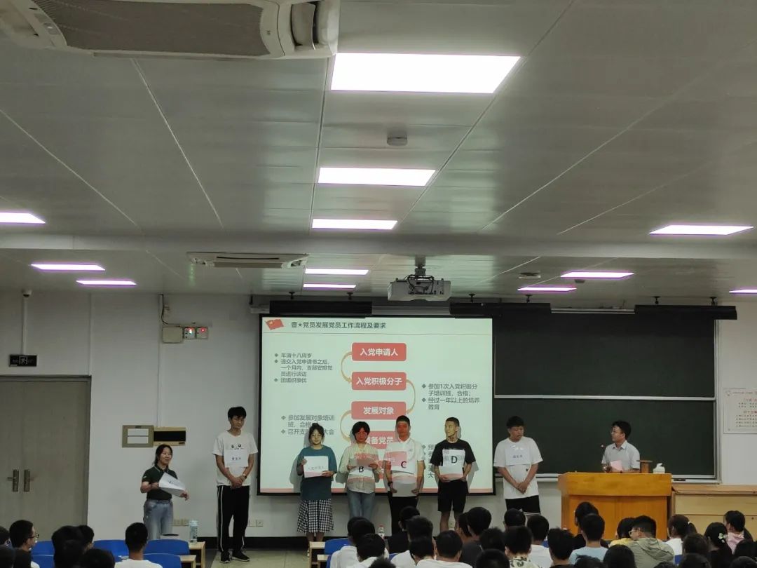 活动最后,党建辅导员杨凯向同学们讲授了“大学生入党流程和要求解读”。他邀请本科党建联席会的同学们指导一年级新生以幽默生动的表演,展示了发展党员工作流程。他以校内外优秀党员的事迹,号召同学们端正入党动机,在努力向党组织靠拢的过程中争做优秀社会主义新青年,在服务人民、奉献社会的实践中实现自己的人生价值。