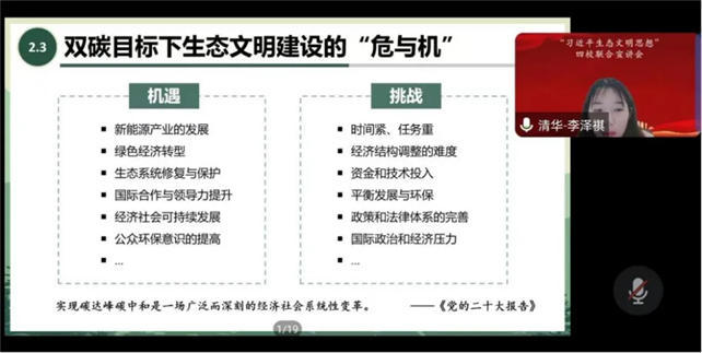 清华大学环境学院博士生李泽祺以“习近平生态文明思想引领下的双碳之路”为题,道出习近平生态文明思想具有丰富内涵,在中国这片沃土上有得天独厚的优势。同时,指出双碳背景下生态文明建设的危机与机遇,提出青年人要携手助力双碳目标的实现。