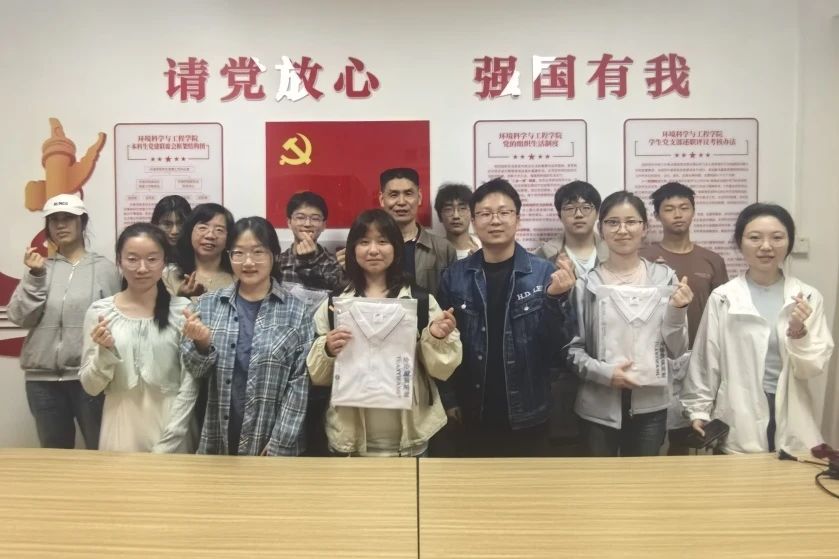 会议尾声,志愿者们从杨群老师与吕朝敏主任手中接过印有“爱心助老,环境青年行”的定制短袖。这一设计不仅彰显了团队凝聚力,更寓意着环境青年将以实际行动践行志愿服务精神。