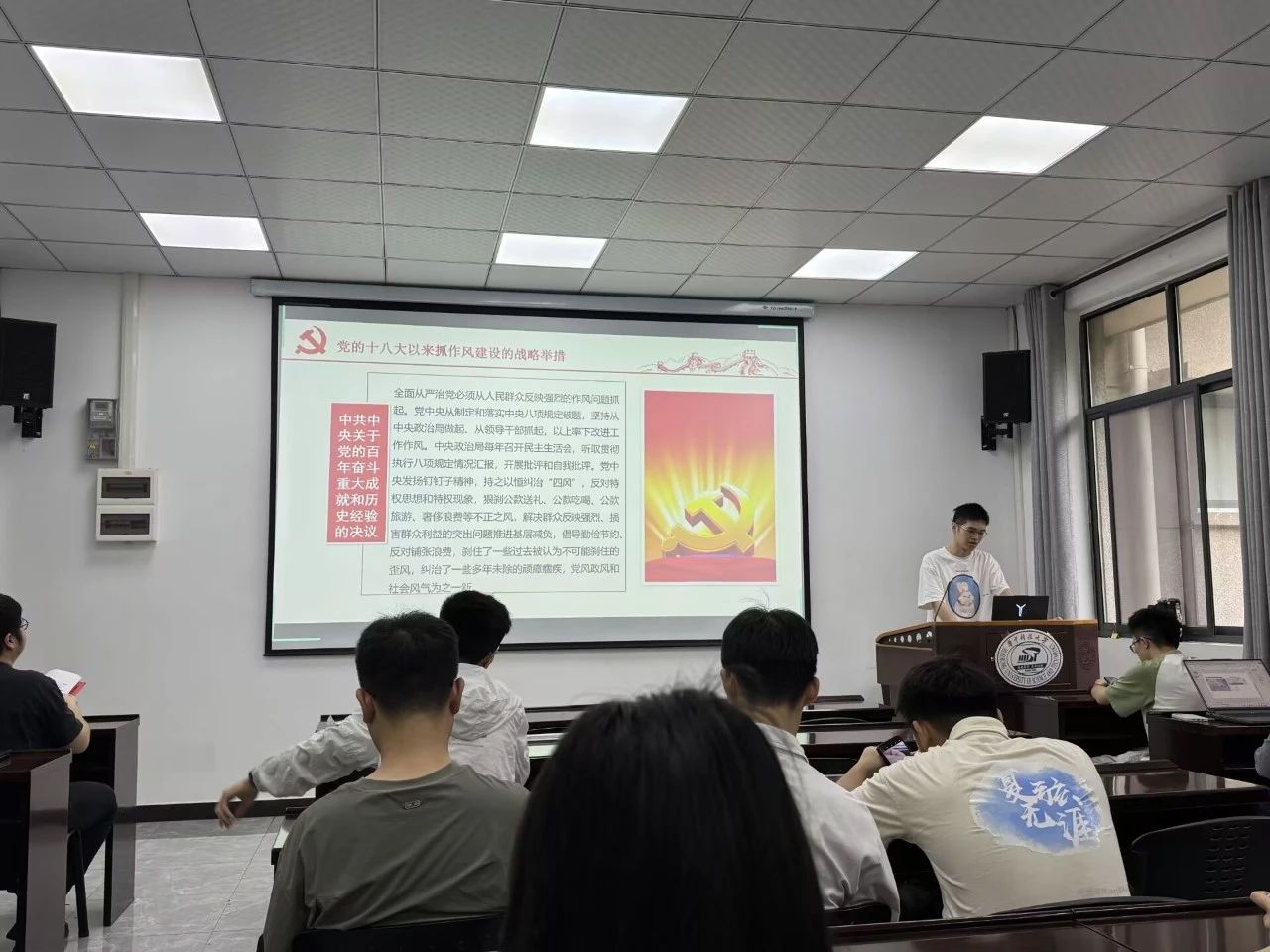 随后,会议聚焦“党的作风建设”主题,重温 “狱中八条”及中央八项规定精神,分析当前“四风”问题新表现,强调需从政治高度审视作风问题,尤其关注科研领域的形式主义、学术不端等潜在风险。通过典型案例警示教育,党员们进一步明确“作风建设永远在路上”的深刻内涵,承诺以实际行动践行清正廉洁的科研风气。