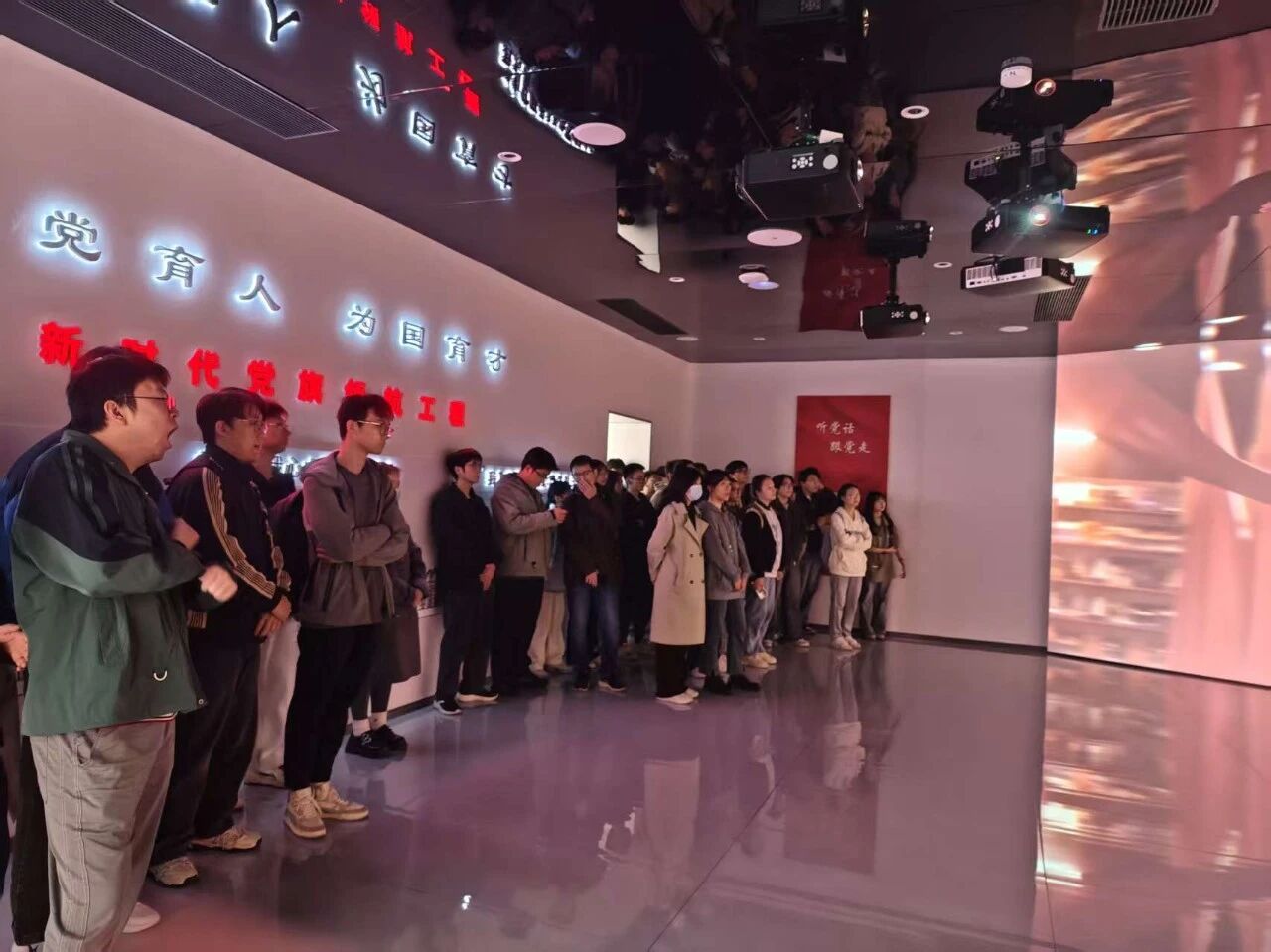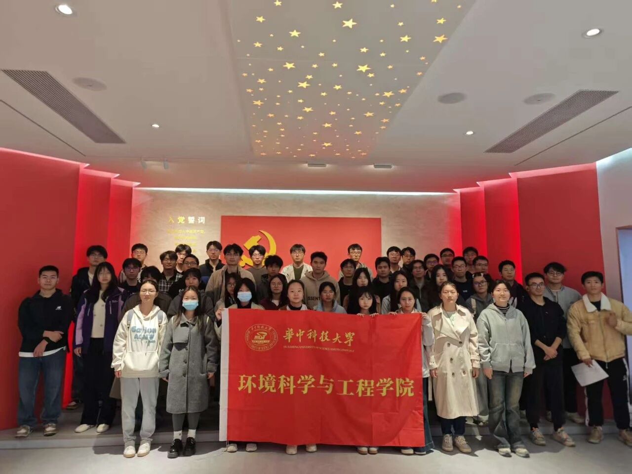 参观尾声,师生们在党员宣誓墙前合影留念,誓言铿锵。这场沉浸式的党建课堂,不仅是成果的展示,更是精神的传承。未来,环境学院将继续以党旗为引领,深化新时代党旗领航工程,在教书育人、科技创新、社会服务的征程上踔厉奋发,为推进高水平科技自立自强、民族复兴伟业贡献华科力量!