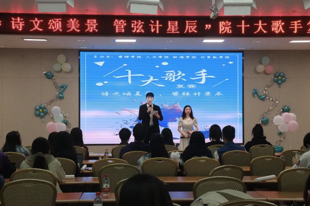 2023年4月2号晚六点半,由环境科学与工程学院、人文学院、计算机科学与技术学院、管理学院联合举办的“诗文颂美景,管弦计星辰”十大歌手复赛,在伟德(bevictor)官方网站管理学院206教室如期举行。
