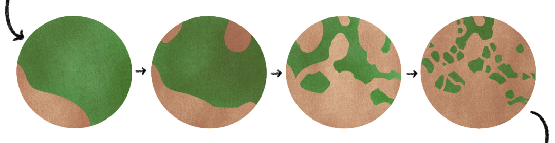 那什么是边缘效应呢?在森林与非森林的交界位置,生存环境非常容易受到周边非森林土地的影响。温度、湿度、光照和风力等因素的变化都会影响到森林内部的生长条件,对许多植物的生长和生存产生一些不良影响,从而间接影响到依赖这些植物生存的动物们。随着破碎化的程度增大,森林形状越来越不规则,许多原本常驻物种难以继续生存,它们相继逃离或者因为缺乏适宜的生存环境,种群数目快速降低。这也对生物多样性造成了严重的影响。