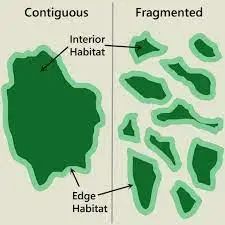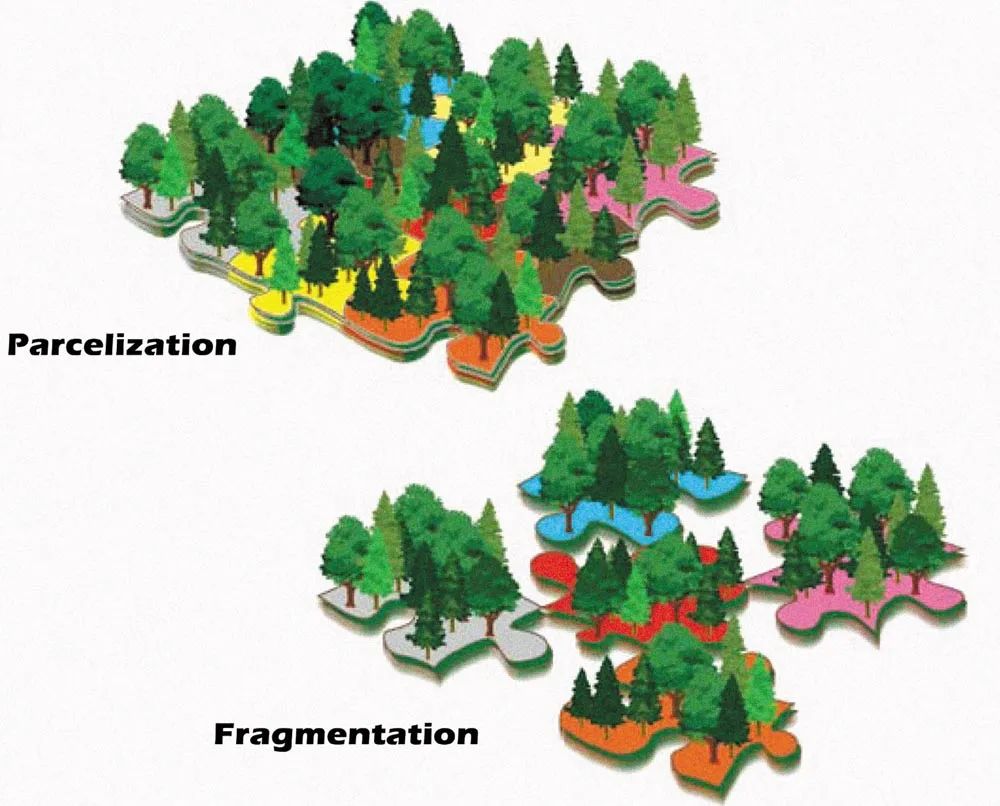 森林破碎化是指连续的森林因为人类生产生活的需要被分割成较小的、孤立的森林斑块。由于人口的扩展和社会发展的需要,我们的城市迅速膨胀,部分道路、公共设施和建筑逐渐入侵原有的森林,造成了森林的破碎化,而森林斑块之间的隔离程度以及边缘效应则连锁式的导致了生物多样性的降低。