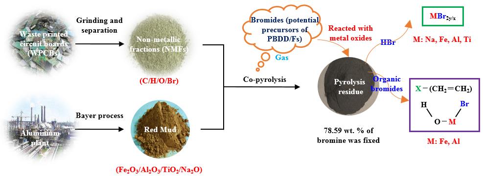 目前针对废弃印刷电路板的处理与处置主要集中于有价金属回收的研究,剩余大量非金属粉末的处理处置是普遍难题,热解技术可以实现其减量化。论文对废弃印刷电路板回收金属后残余非金属粉的热解动力学进行了深入探索,首次将离散分布活化能模型应用于非金属粉热解动力学研究中,为非金属粉热解的工程应用提供了理论依据。此外针对非金属粉中的含溴组分环氧树脂在热解过程中会释放溴代污染物引起二次污染的问题,首次将赤泥作为催化剂用于固溴,研究了热解气中有机/无机溴代污染物与赤泥的界面作用机理,阐明了赤泥中金属氧化物的协同固溴作用,为电子废弃物热处理过程中尾气污染控制提供了新思路。