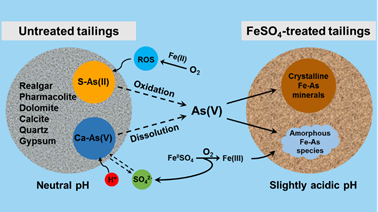 该研究深入探讨了基于硫酸亚铁的雄黄尾矿稳定化技术,在中试处理的基础之上,从分子层面揭示了硫酸亚铁对雄黄尾矿中矿物转化过程的促进作用,实现了亚稳态含砷矿物(如雄黄和毒石)向更稳定铁砷矿物的高效转化。