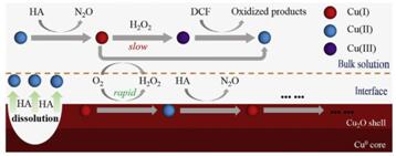 文章报道了一种高效的高级氧化技术(nCu/HA/O2),由于纳米铜呈现Cu0@Cu2O核壳结构,氧气在纳米铜表面被Cu(I)单电子还原活化,并经过一系列的反应生成氧化能力强的Cu(III),从而有效降解双氯芬酸。而羟胺的加入更是有效促进了纳米铜表面和液相中Cu(I)/Cu(II)/Cu(III)的循环,显著提升了纳米铜对氧化的活化效率。此外,该体系适用于中性和弱酸性条件,纳米铜经3次回收使用后仍体现出了很好的催化效果,且出水中溶解性铜的浓度低于20 μM,对水体环境影响小。本文为水中典型PPCPs的处理提出了一种高效且适用性好的高级氧化技术,有利于拓展纳米铜催化技术在水处理领域中的应用。