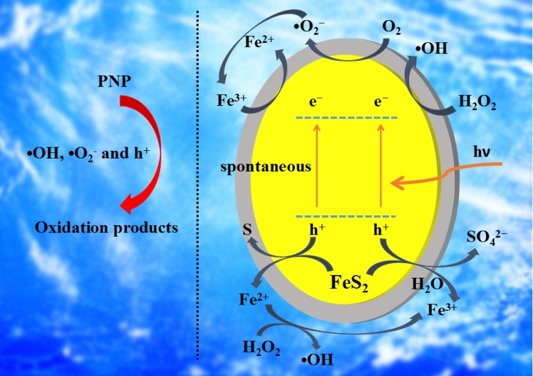 黄铁矿是自然界中普遍存在的一类铁矿,其用于Fenton技术处理有机废水时有较高的处理效率。该文章以高毒性的对硝基酚(PNP)为目标污染物,构建了黄铁矿芬顿(Pyrite-F)和黄铁矿光芬顿(Pyrite-PF)反应,研究了黄铁矿作为异相Fenton催化剂处理有机物的能力,系统地考察了降解反应过程中体系的变化、催化剂稳定性、可见光对降解体系的影响、反应的降解机理、污染物的降解路径等内容。黄铁矿在催化H2O2降解PNP时有较高的效率和很好的稳定性,EPR结果显示,重复使用3次后的FeS2能更有效地催化生成•OH和•O2−,且Pyrite-F和Pyrite-PF反应中也存在h+,•OH,•O2−和h+均起到了重要的氧化降解作用。该文章的研究内容为黄铁矿应用于污水处理提供了一定的研究经验。