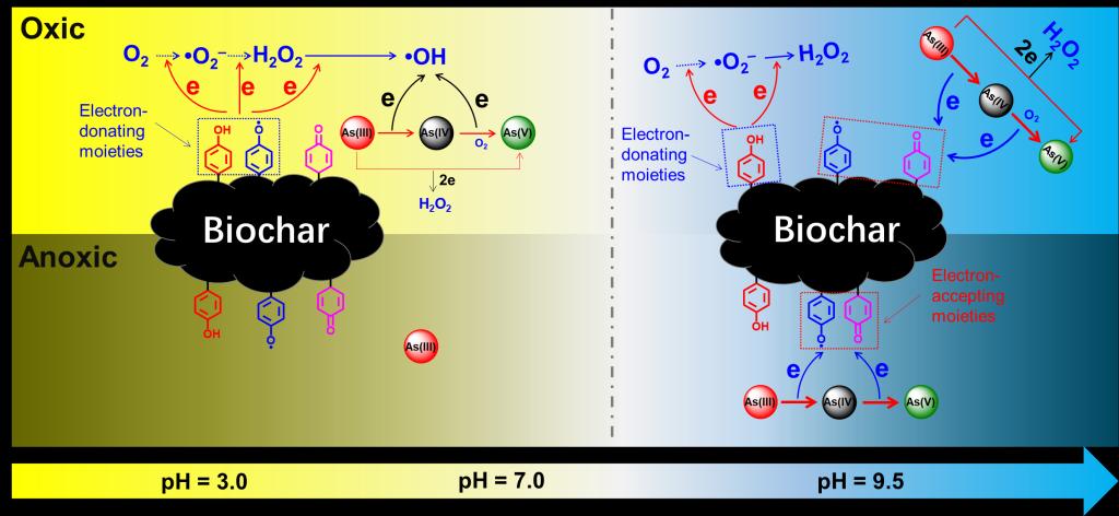 本研究揭示了生物炭对As(III)的pH和O2依赖性的氧化机制,它将有助于对生物炭等固体炭(甚至包括活性炭、氧化石墨烯和碳纳米管等)氧化As(III)的理解与认识,同时也阐明了碳基材料特别是其表面的RAMs在环境修复中的重要意义。