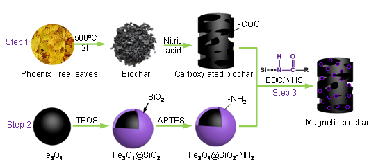 生物吸附法作为一种新兴的重金属废水处理技术,展现出良好的应用前景。但传统的生物吸附剂颗粒小、机械强度低、难以从溶液中分离,而磁分离是一种简单高效的分离方法。本研究将生物吸附和磁分离技术有机结合,采用废弃生物质为原料制备生物炭,通过化学交联的方式在生物炭表面嫁接改性Fe3O4/SiO2核壳结构的磁性纳米粒子,制备了一种新型磁性生物吸附剂材料,并将其应用于酸性含Cr(VI)溶液的吸附去除,阐明了新型磁性生物吸附剂对Cr(VI)的吸附机理。