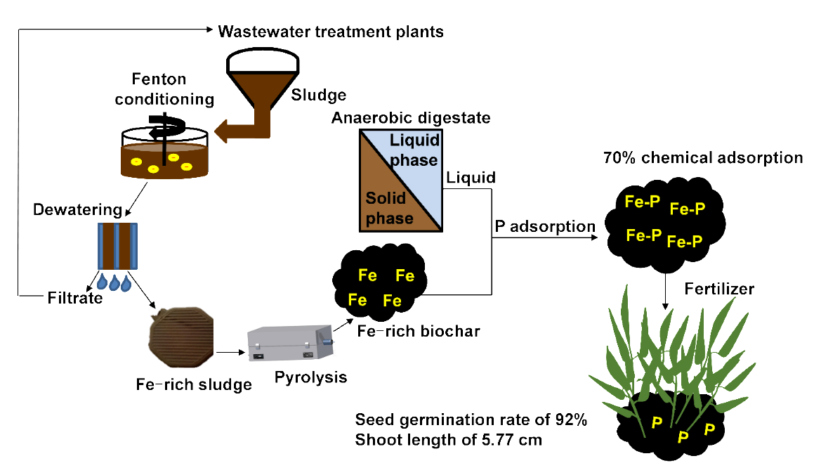 铁激发的高级氧化技术因在促进污泥深度脱水方面具有优异的特性而被广泛研究。但该过程添加的含铁试剂不可避免的会产生大量的含铁泥饼,对泥饼后续的处理处置带来挑战。该论文以含铁污泥为原料,热解制备富铁生物炭,探究富铁生物炭与厌氧沼液中磷的反应。研究结果发现300 oC热解制备的富铁生物炭(Fe-300)相比其他高温热解制备的生物炭(500-900 oC)显示了更好的吸附效果;Fe-300生物炭对磷最大吸附量为1.843 mg/g,并且主要吸附厌氧沼液中的正磷酸盐和焦磷酸盐;在整个吸附过程中化学吸附占70%,物理吸附占30%;富铁生物炭上的磷具有可生物利用性,能促进种子发芽,发芽率为92%,与未添加生物炭的相比(发芽率为66%);溶磷微生物铜绿假单胞菌(Pseudomonas aeruginosa)能促进生物炭上Ortho-P和Pyro-P的释放。本研究提出的可持续污泥回收系统,无论是污水处理厂污泥处理,还是厌氧沼液中的磷回收,都具有良好的应用前景,具有显著的环境效益。