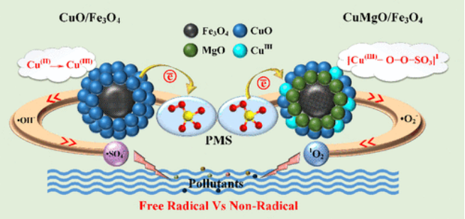 论文通过CuO/Fe3O4体系引入MgO将自由基PMS活化的过程转变为非自由基过程,增强了该体系对污染物去除的催化性能,密度泛函计算、定量构效关系、动力学同位素效应(KIE)及材料表征等研究揭示了增强催化性能的机理。