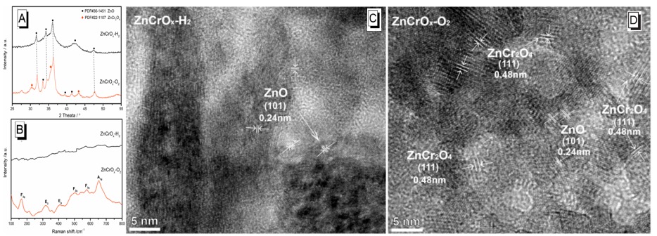 图3. ZnCrOx-H2和ZnCrOx-O2样品的XRD(A)、Raman图谱(B)和高分辨透射电镜图(C,D)