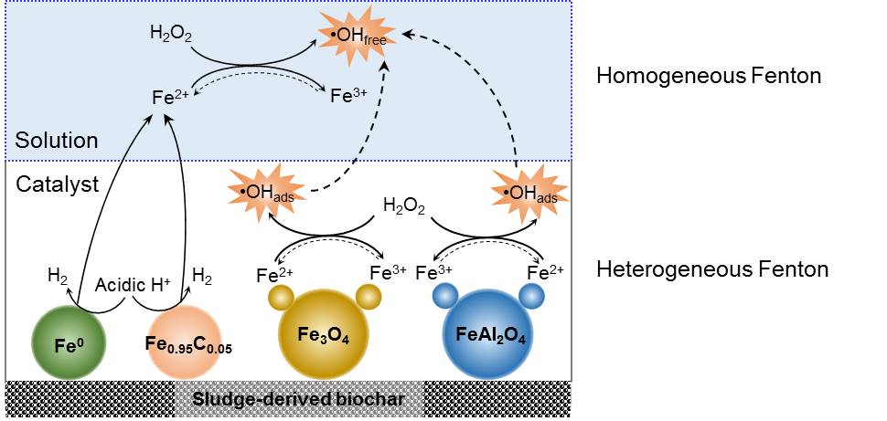 市政污泥产生量大,其含水率高、有机物含量高的特点导致脱水困难。铁基调理剂广泛用于污泥的化学调理及深度脱水,但由此产生的大量含铁泥饼亟待有效的处理处置。本研究以团队前期开发的Fenton-赤泥复合调理剂调理污泥得到的深度脱水泥饼为原料,通过热解制备了含多种价态铁化合物(Fe0,Fe0.95C0.05,Fe3O4和FeAl2O4)的富铁生物炭功能材料。考察了热解温度和污泥调理剂组成对生物炭含铁物相组成的影响。将富铁生物炭材料用作催化剂活化H2O2降解4-氯苯酚(4-CP),当pH 为 2,4-CP初始浓度为0.78 mM,生物炭投加量为2 g/L,H2O2投加量为30 mM时,4-CP的降解效率可在20 min内达到100%。机理研究实验表明,在4-CP的降解过程中,由低价态的Fe0和Fe0.95C0.05在酸性条件下浸出到溶液中形成的Fe2+激发的均相Fenton反应和难以溶出的固相Fe3O4和FeAl2O4催化的异相Fenton反应共同发挥了作用。在五轮生物炭循环降解4-CP实验后,4-CP的去除率仍可以达到100%,且均相Fenton反应主要在第一轮降解实验中起作用,后续的循环降解实验中异相Fenton反应起主要作用。该研究成果为含铁污泥资源化及富铁生物炭的应用提供了参考。