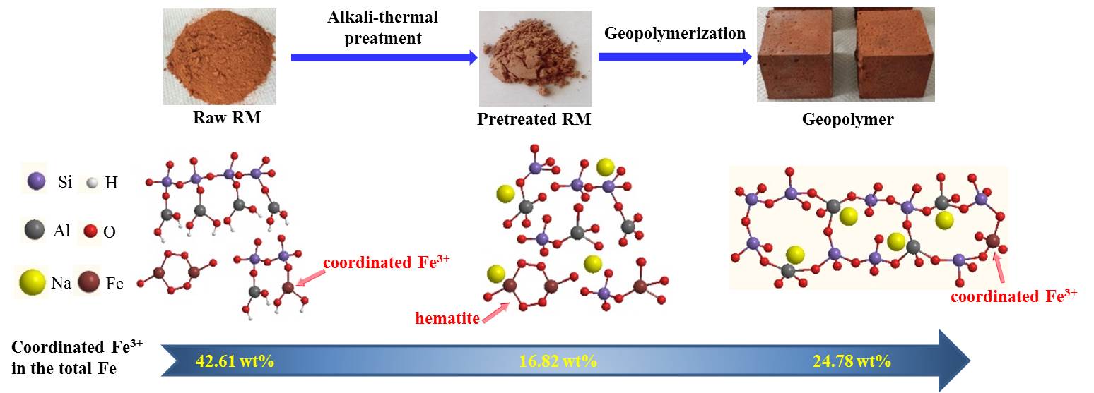 拜耳法赤泥是氧化铝厂以拜耳法工艺生产氧化铝后产生的碱性残渣,由于其碱度高,成分复杂,其综合利用一直是世界性难题。近年来利用赤泥制备地聚物是国内外的研究热点。本研究采用的赤泥原料来源于中国铝业集团山东分公司,其以印尼进口铝土矿为原料,产生的赤泥中Fe2O3含量高达33.88 wt%。首先对赤泥进行热碱活化预处理提高赤泥中硅、铝活性,随后将活化赤泥与粉煤灰复配制备地聚物。文章深入研究了赤泥粉煤灰地聚物形成机理,揭示了赤泥热碱活化过程中铝硅活化规律和地聚物形成过程矿相转化规律,阐明了铁元素在地聚物反应过程中的关键作用机制,为赤泥的大规模综合利用奠定了基础。