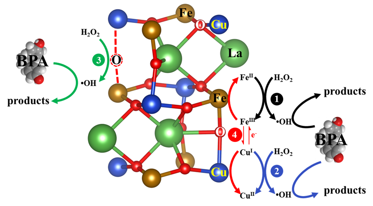 高级氧化技术处理难降解有机污染物过程中常由于副反应较多而无法获得较高的氧化剂利用率。理论计算结果表明,过氧化氢在富电子区域更易均裂为羟基自由基而非分解为水和氧气,从而提升高级氧化效率。基于钙钛矿结构氧化物的稳定性质,通过铜取代在铁酸镧晶体中引入氧缺陷,得到了具有多活性位点的非均相类芬顿催化剂。氧缺陷的存在造成了催化剂表面电荷的重新分布,形成了富电子-贫电子区域,既促进了过氧化氢分解为羟基自由基的效率,也加速了铜-铁离子在各自高低价态间的循环。在pH3-6范围内,过氧化氢利用率超过90%。密度泛函计算结果表明,当铜离子,铁离子和氧缺陷共同存在时,过氧化氢主要分解为羟基自由基;无氧缺陷存在时生成物中氢氧根离子居多;催化剂表面仅存在铁元素使主要分解产物为水和氧气。该研究结果有助于设计制备高效的非均相类芬顿催化剂。