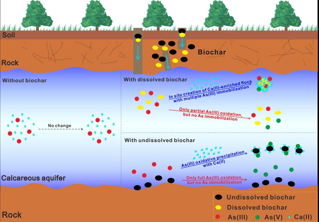 人工黑炭(生物炭)可通过地下水/土壤原位修复等多种途径进入地下水环境并参与地球化学环境过程,进而潜在影响周围环境中共存污染物如As的迁移与转化行为。本研究深入考察了还原性生物炭的非可溶性组分(reductively undissolved biochar,rUBC)和可溶性组分(reductively dissolved biochar,rDBC)在模拟的碱性(pH 11.5)无氧的含Ca2+(或无Ca2+)地下水条件下对As(III)的迁移与转化的影响。研究结果表明,尽管单独的生物炭组分(即rUBC和rDBC)或Ca2+均对As(III)无表观固定作用,但是rUBC/Ca2+和rDBC/Ca2+共存体系分别协同固定73.1%和89.6%的As(III)。进一步的液固两相形态分级并结合多种光谱学表征结果揭示了,在rUBC/Ca2+/As(III)体系中,rUBC表面残留的氧化还原活性基团(如persistent free radicals和醌基C=O)能将As(III)完全氧化成As(V),进而与吸附于rUBC表面的Ca2+发生沉淀反应而实现As(III)表观固定。相比之下,在rDBC/Ca2+/As(III)体系中,rDBC诱导溶液中离子态Ca2+高度富集于原位新生的固相絮体上,进而直接与绝大多数As(III)以及少许新生的As(V)通过rDBC-Ca-As三重络合形式发生沉淀反应促进As(III)表观固定。结合Ca2+抑制As(III)氧化现象和FTIR光谱结果,我们进一步阐明了rDBC-Ca-As三重络合物是由于rDBC表面的含氧官能团与As阴离子通过Ca2+桥接作用而形成。与此同时,rDBC-Ca絮体在原位形成过程中也可物理性捕获少许As(III)和新生的As(V)进而聚沉。此外,我们进一步研究表明,增加Ca2+浓度(0–100 mM)和升高环境pH(10–12.5)均可有效增加rUBC/Ca2+/As(III)和rDBC/Ca2+/As(III)体系中As(III)的表观固定能力。本研究补充并加深了人们对生物炭在富钙地区的地下水环境中诱导As(III)的固定与转化行为的认识与理解。