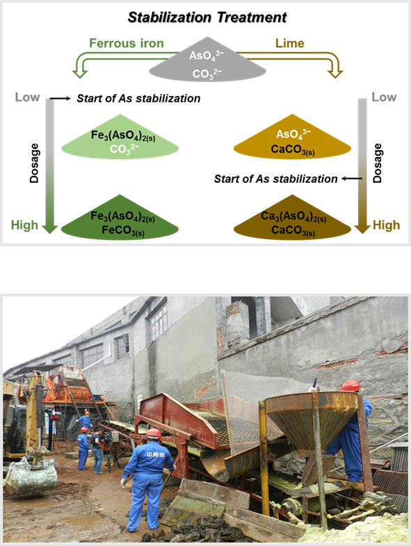 文章报道了一种绿色高效的砷碱渣(AAR)稳定化处理技术。砷碱渣是锑冶炼过程中产生的一种危险废物,因其具有极高的砷浸出毒性而备受关注。本研究在对比亚铁盐和石灰稳定化效果的基础之上,从矿物表征和理论计算等多个角度揭示了砷碱渣中共存可溶性碳酸盐在砷稳定化过程中的关键影响,提出了亚铁盐引发高稳态铁砷矿物(Symplesite)生成的砷稳定化新机理,为砷碱渣及其类似含砷固废的亚铁盐稳定化技术提供了理论依据。此外,本研究的相关成果已在湖南益阳某冶金工业园区得到实际工程应用。