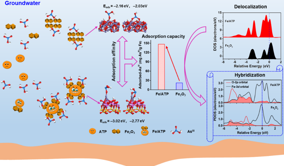 文章报道了水环境中的黏土颗粒促进赤铁矿吸附三价砷的详细机制。砷作为水环境中最为普遍的无机污染物之一,因其具有极高的毒性和迁移性而备受关注。本研究利用铁载凹土复合材料模拟水环境中黏土颗粒与赤铁矿的共存体,借助矿物表征和理论计算揭示了黏土颗粒对赤铁矿表面性质的影响,从分子层面上解释了黏土颗粒促进赤铁矿吸附三价砷的新机理,为理解三价砷在自然水环境中的迁移转化以及固定行为提供了新的思路。