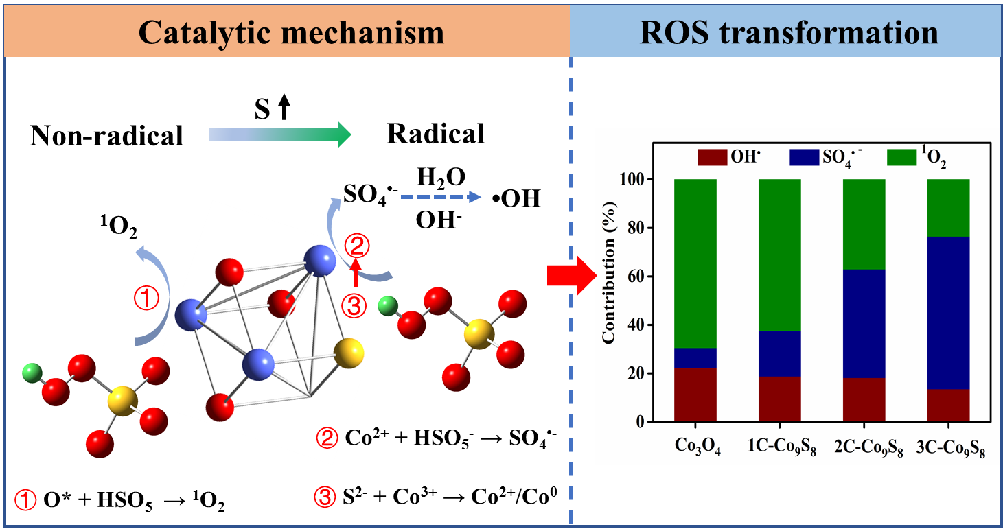 论文第一作者为环境科学与工程学院周新全博士生,通讯作者为陈朱琦教授。论文以Co3O4为前驱体制备了一系列不同S掺杂比的Co9S8纳米棒催化剂用于过硫酸盐活化和有机污染物降解,该催化剂表现出优异的催化性能,设计一系列实验揭示了Co9S8/PMS系统O2和SO4的生成途径以及硫掺杂对这一转变的氧化机制,研究成果为过渡金属纳米棒催化剂降解有机污染物提供了一种新的策略。