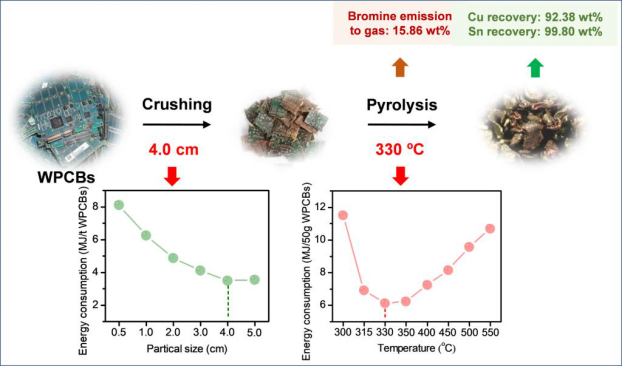论文提出了废弃印刷电路板的预破碎−热解回收金属铜新工艺,优化了相关工艺参数,阐明了热解过程中废弃印刷电路板中溴代阻燃树脂的降解机理,为废弃印刷电路板中的金属回收提供技术参考依据。该研究成果依托于湖北省固废处理处置与资源化技术工程实验室、武汉市危险废物处置与资源化工程技术研究中心、煤燃烧国家重点实验室等科研平台,并获得国家重点研发计划“固废环境资源交互属性与风险调控基础研究”(2018YFC1900105),湖北省创新群体项目(2020CFA042)以及东江环保合作项目联合资助。论文第一作者陈烨博士现在生态环保部海洋生态环境司工作。