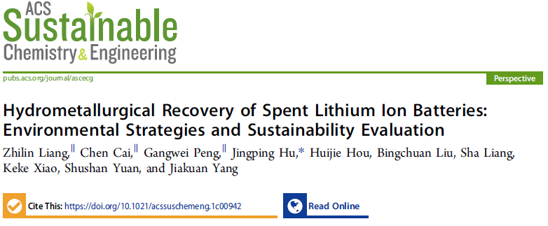 Zhilin Liang#, Chen Cai#, Gangwei Peng#, Jingping Hu*, Huijie Hou, Bingchuan Liu, Sha Liang, Keke Xiao, Shushan Yuan, and Jiakuan Yang. Hydrometallurgical Recovery of Spent Lithium Ion Batteries: Environmental Strategies and Sustainability Evaluation. ACS Sustainable Chemistry & Engineering. DOI: 10.1021/acssuschemeng.1c00942 (https://pubs.acs.org/doi/10.1021/acssuschemeng.1c00942)