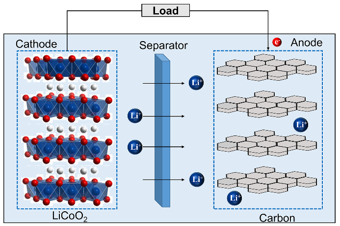 图1 常见锂离子电池结构(以LiCoO2正极,石墨负极为例)
