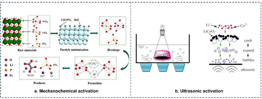 图4 强化浸出工艺:(a)机械化学法活化机理;(b)超声辅助从LiCoO2中浸出Li和Co金属