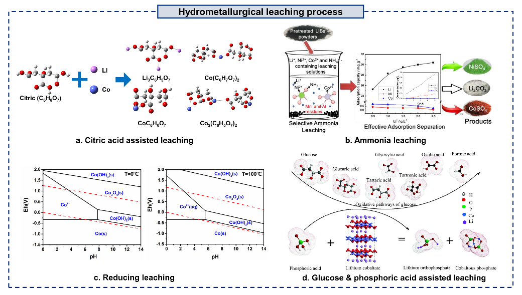 图3 湿法回收工艺:(a)柠檬酸浸;(b)碱浸;(c)钴离子在不同Eh及pH环境中的形态;(d)葡萄糖与磷酸协同还原浸出LiCoO2