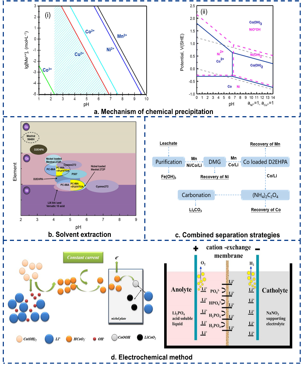 然而,由于渗滤液中元素的多样性,仅用上述单一方法很难实现这一目标。因此,这些方法的组合已被广泛采用,以便更完整和有效地分离有价金属。有研究提出了一种综合回收工艺,包括螯合、沉淀、沉淀和沉淀(图5c)。在这一过程中,镍通过与丁二酮肟的选择性螯合作用回收。然后用D2EHPA分离锰和钴。最后,通过添加(NH4)2C2O4和饱和NaCO3溶液,钴和锂依次析出为CoC2O4和Li2CO3。结果表明,该方法对Li、Co、Ni和Mn的回收率分别达到81%、98.2%、98.7%和97.1%。