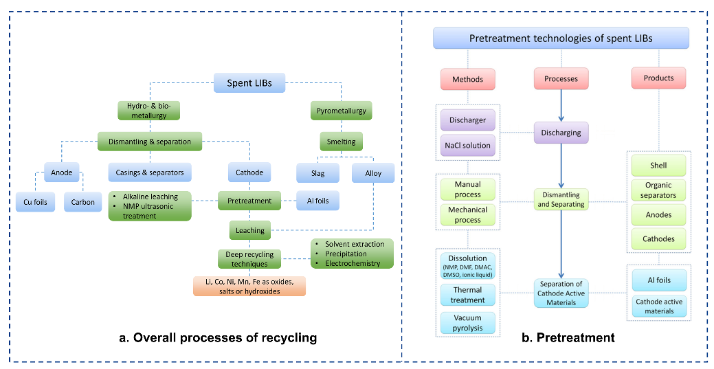 图2 (a)常见废旧锂离子电池回收工艺流程图;(b) 预处理工艺流程图