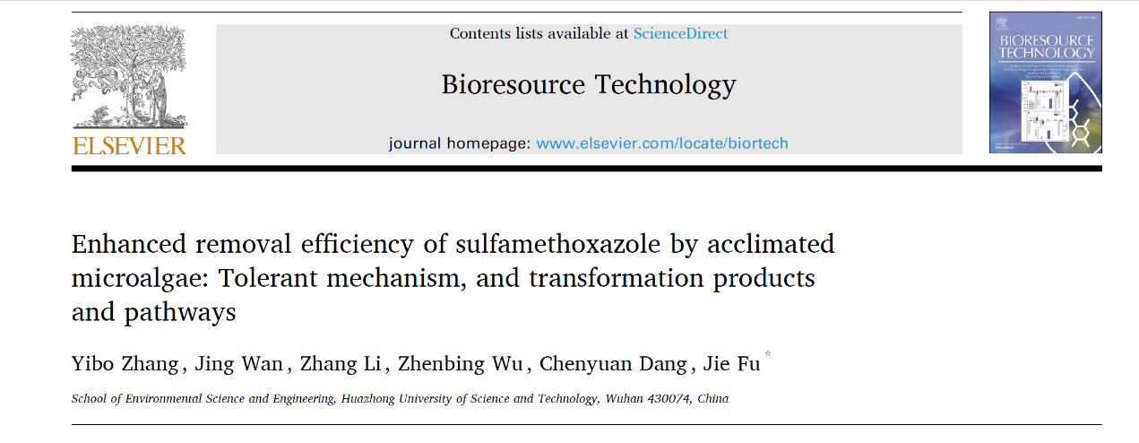 近日,我院付杰教授团队在一区期刊Bioresource Technology发表了题为“Enhanced removal efficiency of sulfamethoxazole by acclimated microalgae: Tolerant mechanism, and identification of transformation products and pathways”的研究论文。该研究通过驯化作用提高了小球藻对典型污染物磺胺甲恶唑(SMX)的去除能力。结果表明,驯化作用增强小球藻的光合作用能力和抗氧化酶 (过氧化氢酶和谷胱甘肽还原酶) 活性,进而提高了小球藻对SMX的耐受性和去除效果。驯化小球藻通过生物吸附、生物积累和生物降解来去除实验体系中的SMX,其中生物降解是驯化小球藻去除SMX的主要途径。实验体系中共鉴定出9SMX降解产物,基于已鉴定出的降解产物预测了降解途径。该研究为提高藻类生物去除污染物能力提供了研究基础和参考。