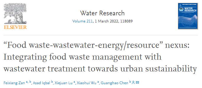 近日,国际水环境领域权威期刊《Water Research》在线发表了我院绿色环境修复团队的综述论文(“Food waste-Wastewater-Energy/Resource” Nexus: Integrating food waste management with wastewater treatment towards urban sustainability. Water Research, Volume 211, 118089)。伟德(bevictor)官方网站环境科学与工程学院为论文第一署名单位,昝飞翔副研究员为论文第一作者,署名作者包括我院吴晓晖教授和陆谢娟老师。《Water Research》作为环境科学与生态领域的顶级国际期刊,2021年公布的最新影响因子为11.236。该论文的发表将为促进我校环境科学与生态学ESI优势学科的稳步前进做出贡献。