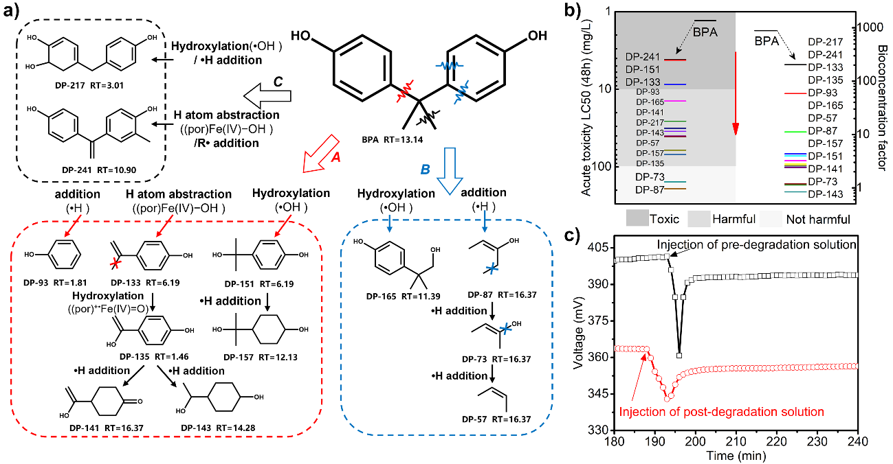 通过对双酚A的降解中间产物的识别,推测双酚A的降解路径,阐明氧中心自由基(•OH, HO2•/•O2−)、高价铁氧卟啉((por)Fe(IV)−OH, (por)+•Fe(IV)=O)以及氢原子(*H)多种活性物种的相互协作作用。并通过QSAR及微生物燃料电池传感表征双酚A降解过程的毒性变化。