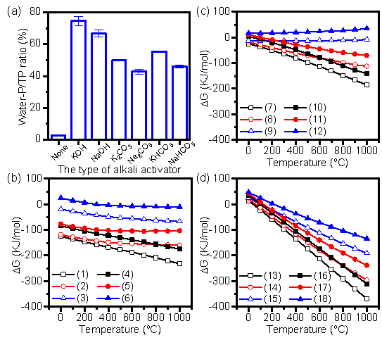 图2 (a)碱活化剂类型对生物炭样品中的Water-P/TP的影响(生物炭样品为原泥在500 oC下添加50 wt%的不同碱活化剂热解所得),以及不同碱活化污泥热解过程中可能发生的碱活化剂与磷酸盐反应的吉布斯自由能变化:(b)KOH/NaOH与三种金属磷酸盐反应,(c)K2CO3/Na2CO3与三种金属磷酸盐的反应,(d)KHCO3/NaHCO3与三种金属磷酸盐反应的吉布斯自由能变化