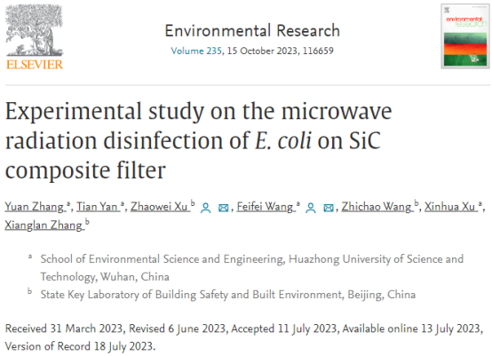 2023年8月,国际期刊《Environmental Research》在线发表了我院徐新华教授团队研究成果(Experimental study on the microwave radiation disinfection of E. coli on SiC composite filter, Environmental Research 2023, 235, 116659)。伟德(bevictor)官方网站环境科学与工程学院为论文第一署名单位。《Environmental Research》作为环境科学与工程领域的权威国际期刊,2023年公布的最新影响因子为8.3。