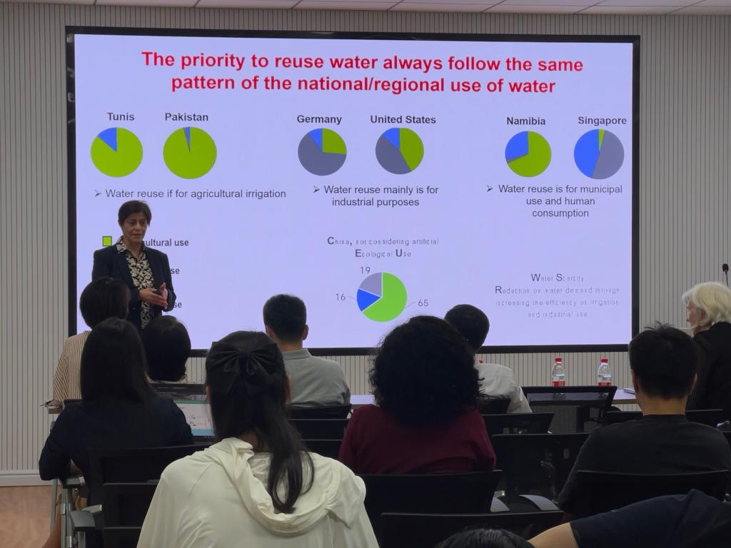 Blanca Elena Jiménez Cisneros教授则以“水的处理与再生”为题,讲述了水处理及再生技术、污泥处理及再气化技术,以及再生水的利用技术评估等内容。Jiménez教授是墨西哥国立自治大学教授,现任墨西哥驻法大使,曾任联合国教科文组织水科学司司长兼国际水文计划秘书,以及联合国政府间气候变化专门委员会(IPCC)淡水资源章节主要作者及协调员。她参与的IPCC报告团队曾获得2007年诺贝尔和平奖。