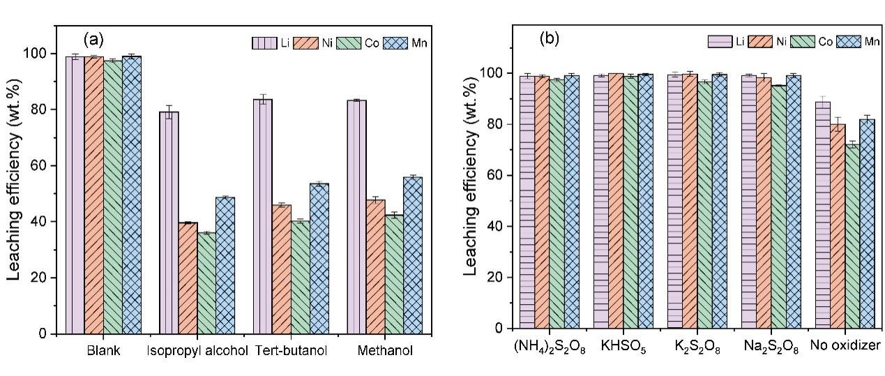 图3. 不同条件下金属的浸出回收率:(a) 不同淬灭剂存在时;(b) 不同氧化剂作用下。球磨条件:转速800 rpm,时间3小时,正极材料:柠檬酸:过硫酸铵质量比为1:4:4;淬灭实验中,NCM111:柠檬酸:过硫酸铵:淬灭剂质量比为1:4:4:8,确保每种氧化剂的投加质量相同。