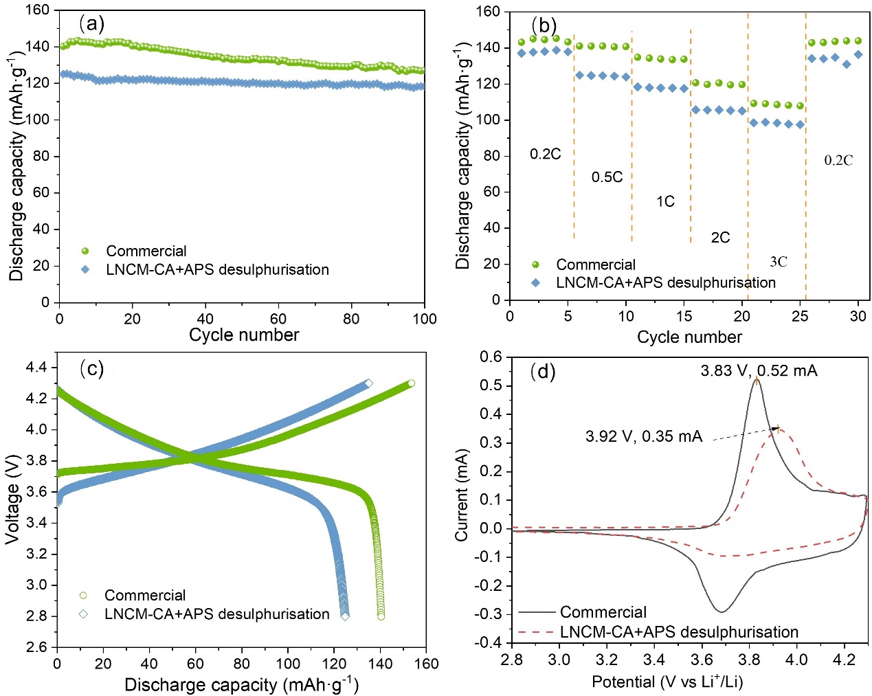本研究成功开发了一种基于湿式球磨的新方法,通过柠檬酸和过硫酸铵的协同作用,有效简化了传统化学浸出步骤,实现了金属离子的原位直接螯合与还原,并生成了均匀的前驱体,从而显著提升了再生NCM正极材料的质量。在优化条件下,Li、Ni、Co和Mn的浸出率均超过97%。过硫酸铵引发的自由基反应能有效促进正极材料结构的解体,进而释放有价金属离子。所得再生正极材料展现出优异的电化学性能,初始放电比容量高达125mAh·g⁻¹,100次循环后容量保持率仍能达到94.64%。生命周期评估表明,该工艺在环境影响和可持续发展方面具有显著优势,为废旧锂离子电池的绿色、高效回收提供了一种富有前景的创新解决方案。