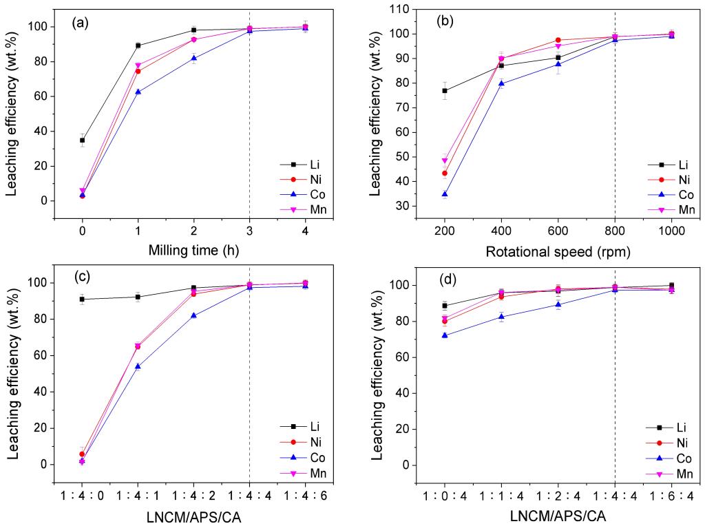 图1 各操作参数对金属浸出率的影响:(a)球磨时间,(b)转速,(c)柠檬酸投加比例,(d)过硫酸铵投加比例。典型球磨条件(若无特别说明):转速800 rpm,球磨时间3小时,NCM111/PDS/CA质量比为1:4:4。