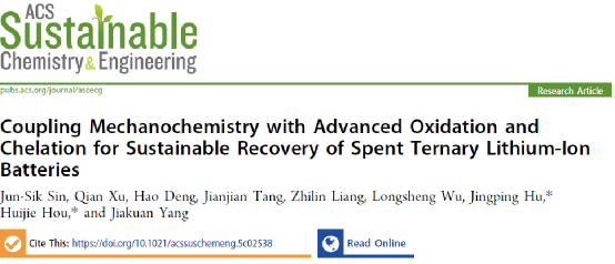 Jun-Sik Sin, Qian Xu, Hao Deng, Jianjian Tang, Zhilin Liang, Longsheng Wu, Jingping Hu,* Huijie Hou,* and Jiakuan Yang. Coupling Mechanochemistry with Advanced Oxidation and Chelation for Sustainable Recovery of Spent Ternary Lithium-Ion Batteries. ACS Sustainable Chemistry & Engineering, 2025, DOI:10.1021/acssuschemeng.5c02538