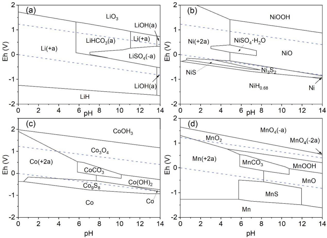 图2. 25℃时反应体系的E-pH图:(a) Li-C-S-N, (b) Ni-C-S-N, (c) Co-C-S-N, (d) Mn-C-S-N(金属离子浓度设定为1 mol/L)。
