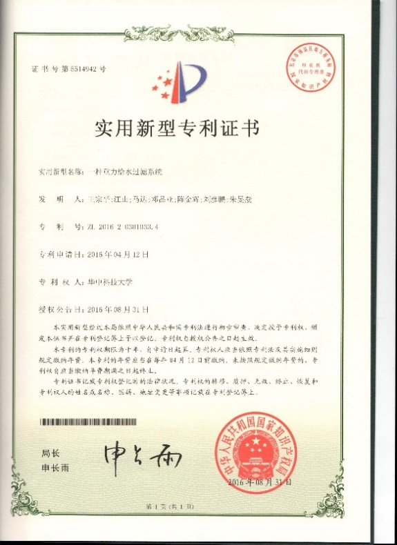 重力无阀滤池因其具有设备简单、投资省、管理方便等优点被广泛应用于农村供水处理厂。但是随着水处理负荷的增大和滤池运行时间的增长,滤池在运行过程会出虹吸管或辅助管长流水、反洗频率加快、反洗不彻底等问题。针对上述缺点,改善了控制进水系统和反冲洗系统,开发了一套新型的重力无阀滤池,通过增设进水控制阀门和反冲洗控制阀门,实现重力无阀滤池的手自一体化控制,有效避免了反洗频率较快的问题,显著提升重力无阀滤池的运行效果,并节约运行成本,获授权专利两项,该成果被广泛应用于多座农村小型水厂,解决300多万人饮水安全问题。