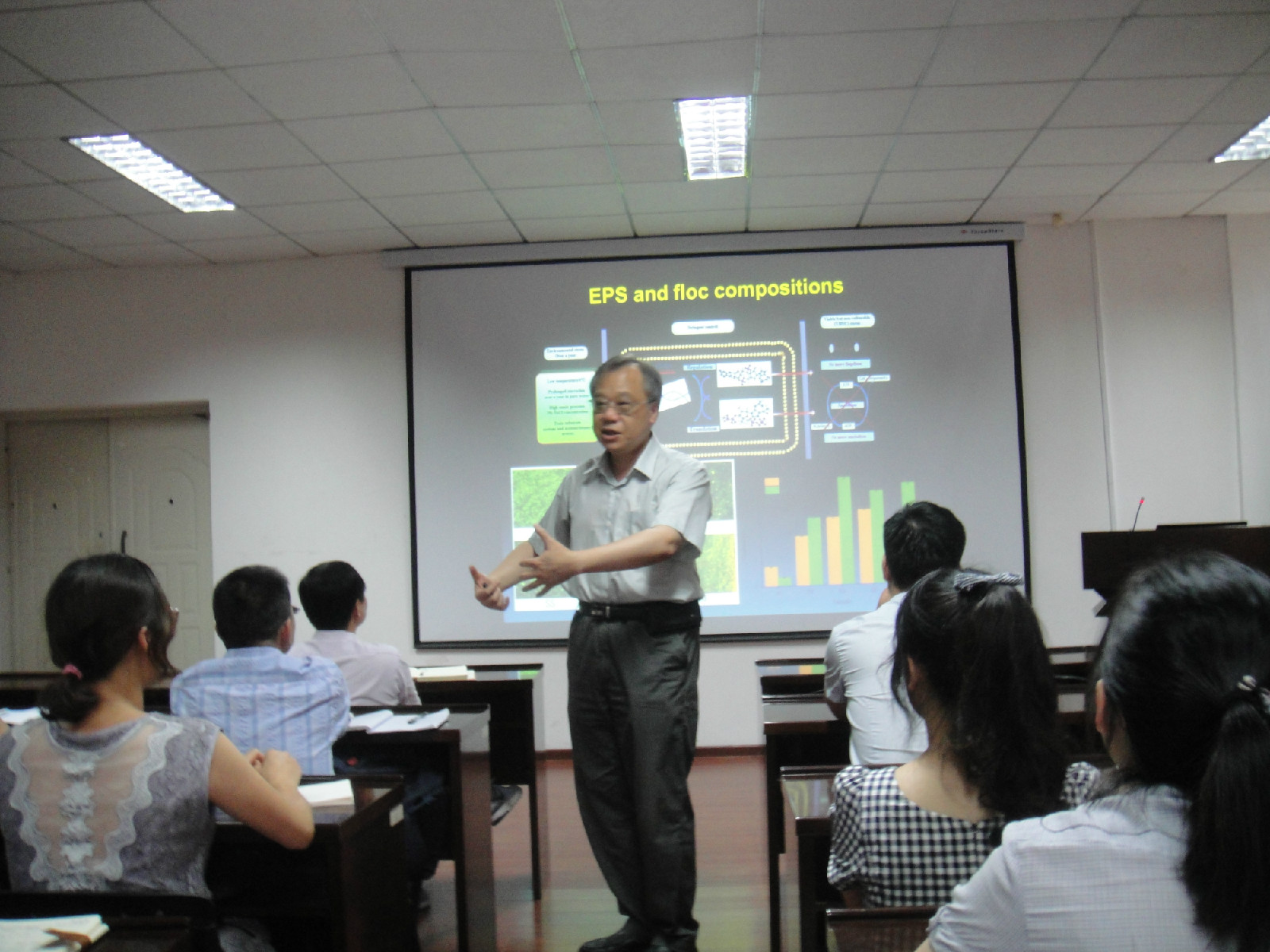 此次访问,李篤中教授作了题为“污泥处置与胞间聚合物”的学术报告。首先对国内外污泥处置的进展作了阐述;其次介绍了各种表征手段对污泥胞间聚合物中不同有机物的结构和分布的研究成果;同时分享了胞间聚合物在膜污染方面的研究。李篤中教授的精彩报告引起了在场科研人员和学生的广泛兴趣。报告结束后,李教授与师生们进行热烈讨论。