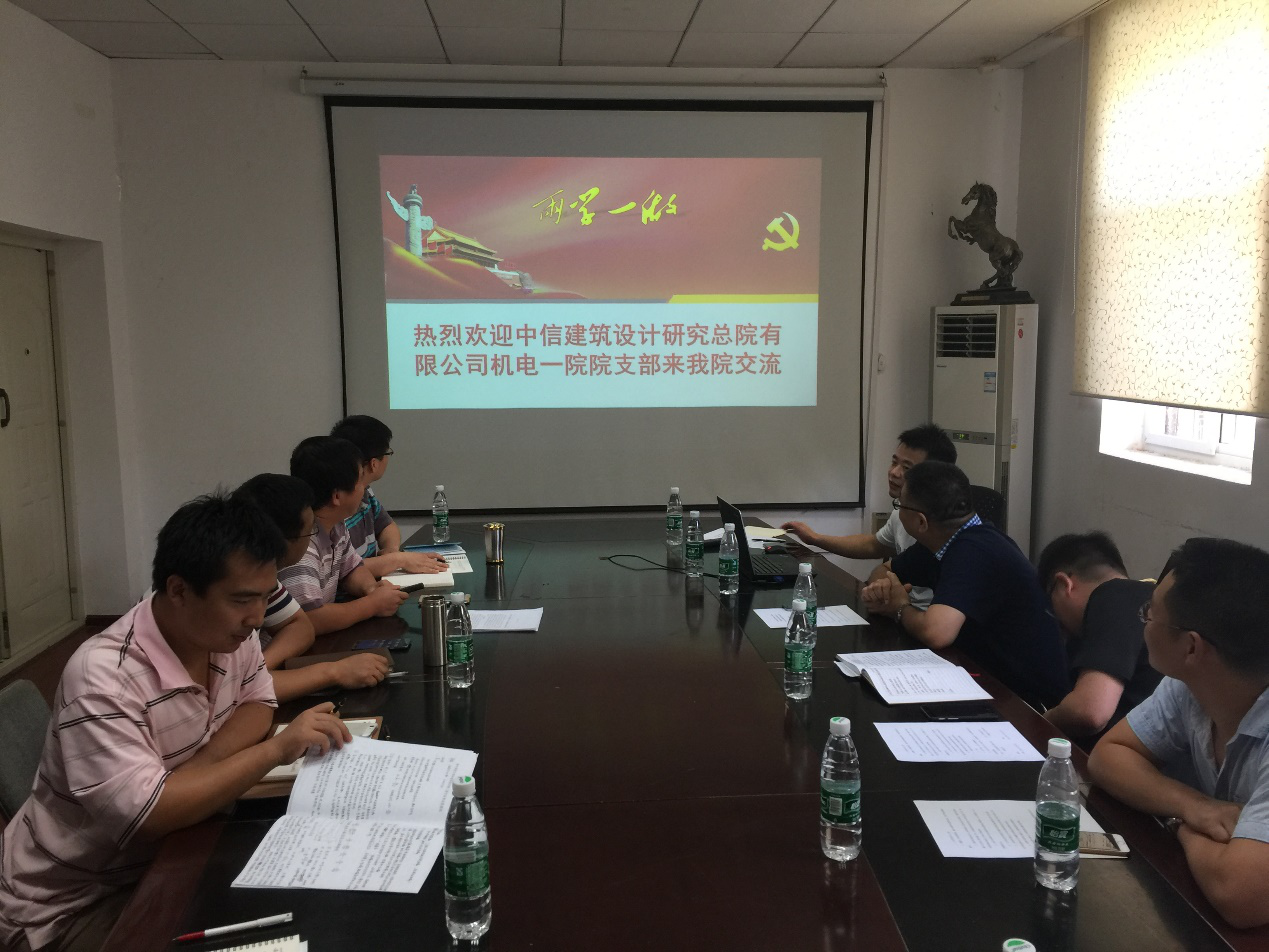 中信院机电一院党支部书记张忠林首先介绍了中信建筑设计研究总院有限公司历史业务、人员、党组织等情况,重点对其支部两学一做学习教育进行介绍机电一院党支部通过学习党章党规、举办专题党课每月组织专题学习和专题讨论并撰写心得等方式加强学习,取得较好的效果。随后我院市政教工党支部书记任拥介绍了支部党员组织生活制度等基本情况交流了支部百日学党章、集中听党课、党章竞答赛、主题党日两学一做”学习教育主题内容