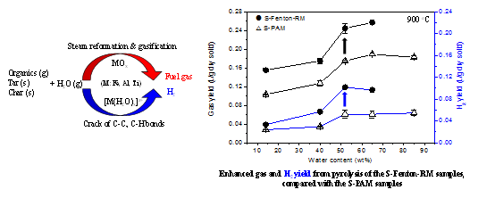 第一篇论文(Jiakuan Yang, Jian Song, Sha Liang*, Ruonan Guan, Yafei Shi, Wenbo Yu, Suiyi Zhu, Wei Fan, Huijie Hou, Jingping Hu, Huali Deng, Bo Xiao . Synergistic effect of water content and composite conditioner of Fenton's reagent combined with red mud on the enhanced hydrogen product ion from sludge pyrolysis. Water Research, 2017, 123: 378-387.),研究发现:添加的碱性含铁废渣既在脱水过程中充当骨架构建体,又在污泥水蒸气气化中能有效促进氢气的产率(见图1)。该研究成果为市政污泥深度脱水泥饼的能源转化提供了新的途径。